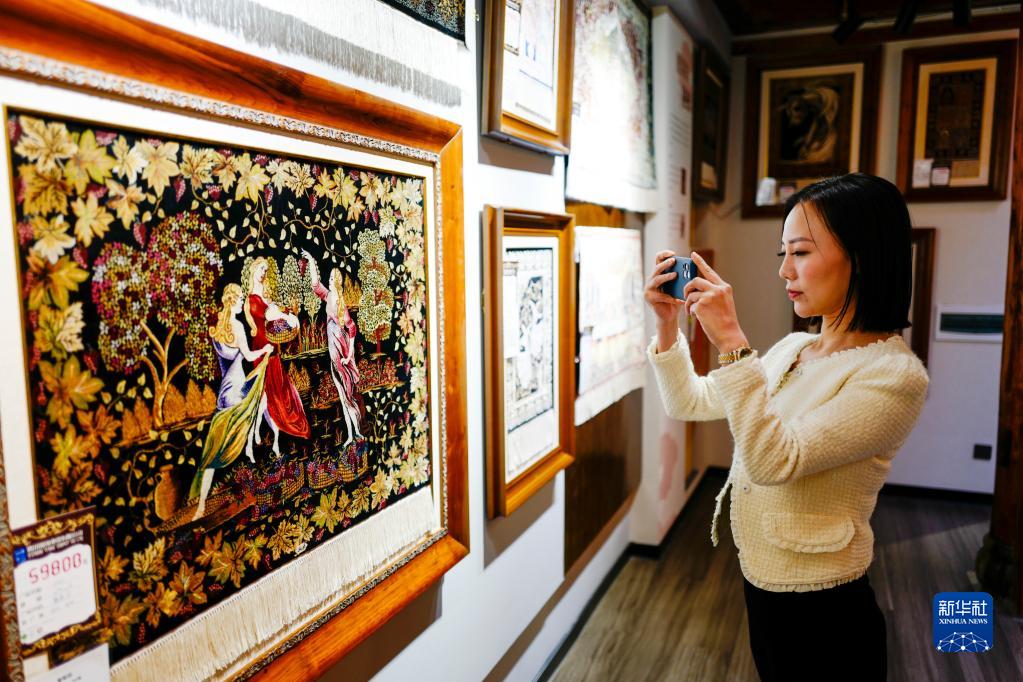 3月21日,游客在銀河絲坊觀賞出口海外的絲毯產品。