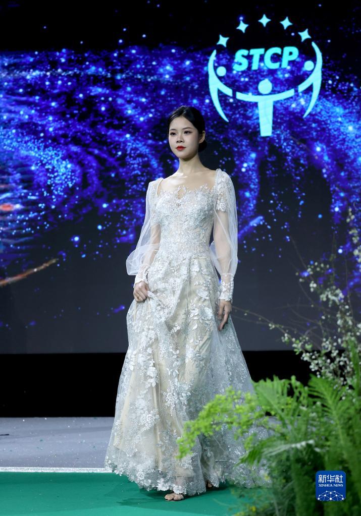 3月29日,模特在“綠色纖維制品可信平臺”發(fā)布會上展示可循環(huán)再利用的時裝。