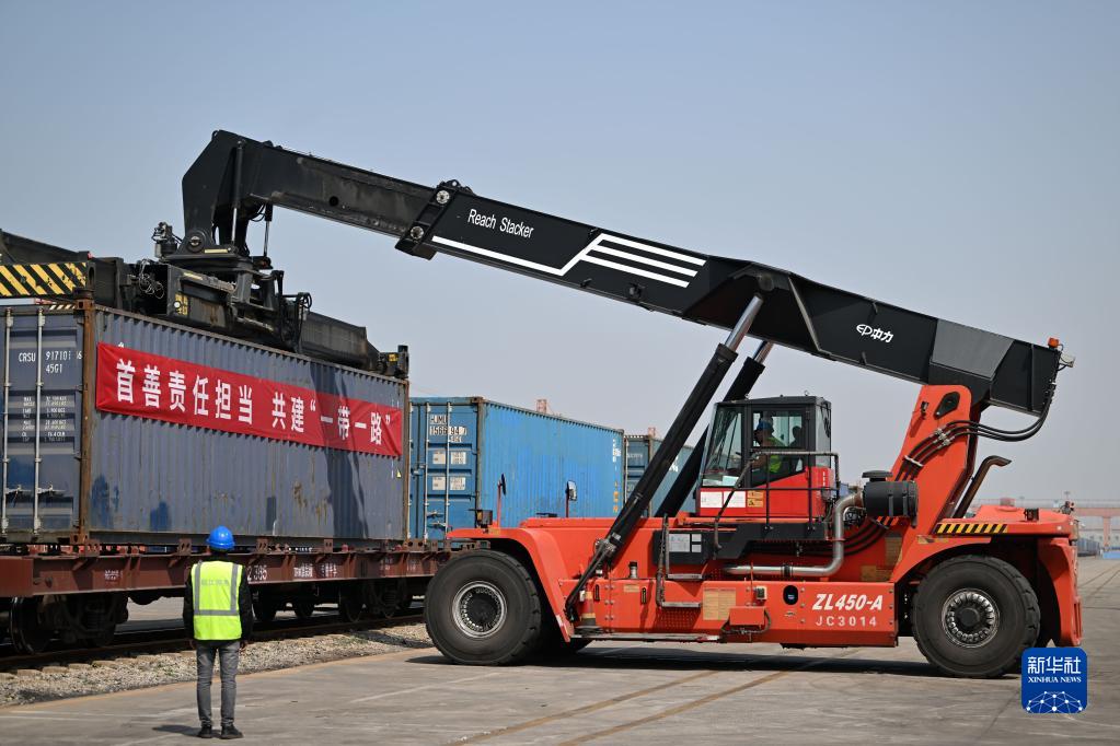 3月29日,在天津開發(fā)區(qū)盛鐵物流有限公司,吊裝車輛進行集裝箱裝車作業(yè)。