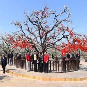 3月29日,游客在寧陵縣萬畝梨園景區的“梨樹王”邊拍照留念。