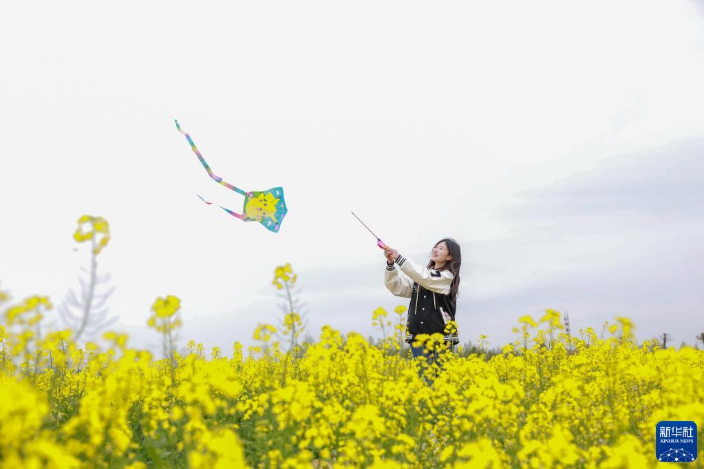 3月29日,游客在來安縣大英鎮一生態農莊內的油菜花海中放風箏。