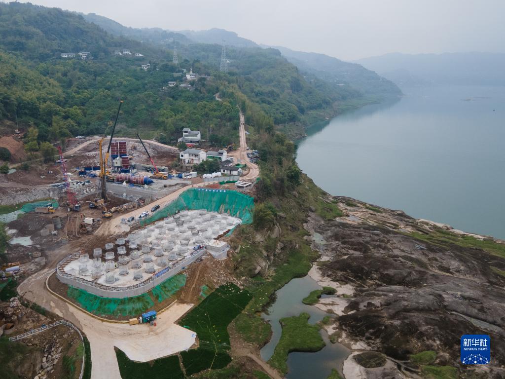 這是在重慶市涪陵區拍攝的石沱長江大橋南岸主塔的施工現場(3月29日攝,無人機照片)。