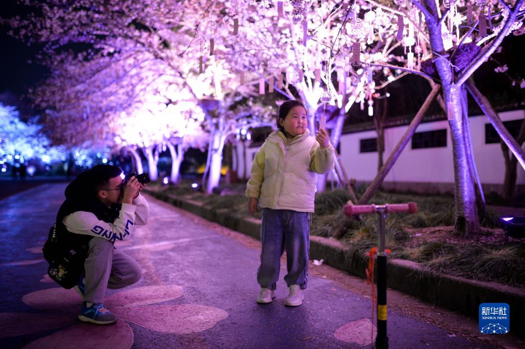 近日,江蘇無錫太湖黿頭渚景區里櫻花盛放,許多游客選擇夜賞櫻花,感受春天的浪漫。
