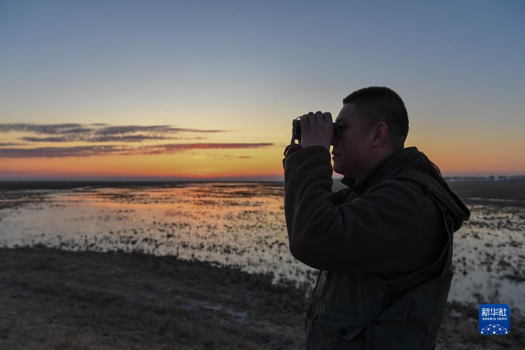 3月29日,在吉林省白城市鎮賚縣濕地,中國野生動物保護協會吉林白城護飛隊隊員王凱觀察候鳥棲息狀態。