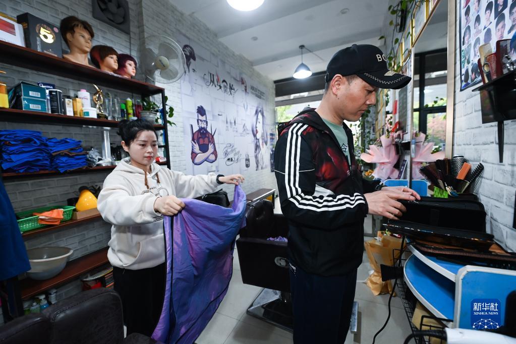 3月30日,在位于杭州市臨平區塘棲鎮的曉珍發藝工作室內,聾啞人王曉珍(左)和丈夫董華良一起收拾理發工具,準備去給盲人門球隊的隊員們義務理發。從2021年開始,王曉珍夫妻倆定期到位于塘棲鎮的國家盲人門球基地為運動員們義務理發。