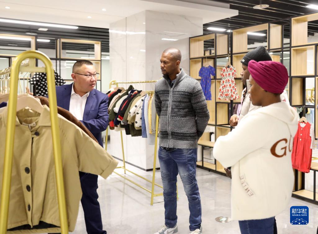 3月30日,織里鎮一家童裝企業的負責人姚東(左)向“洋主播”團隊介紹童裝。
