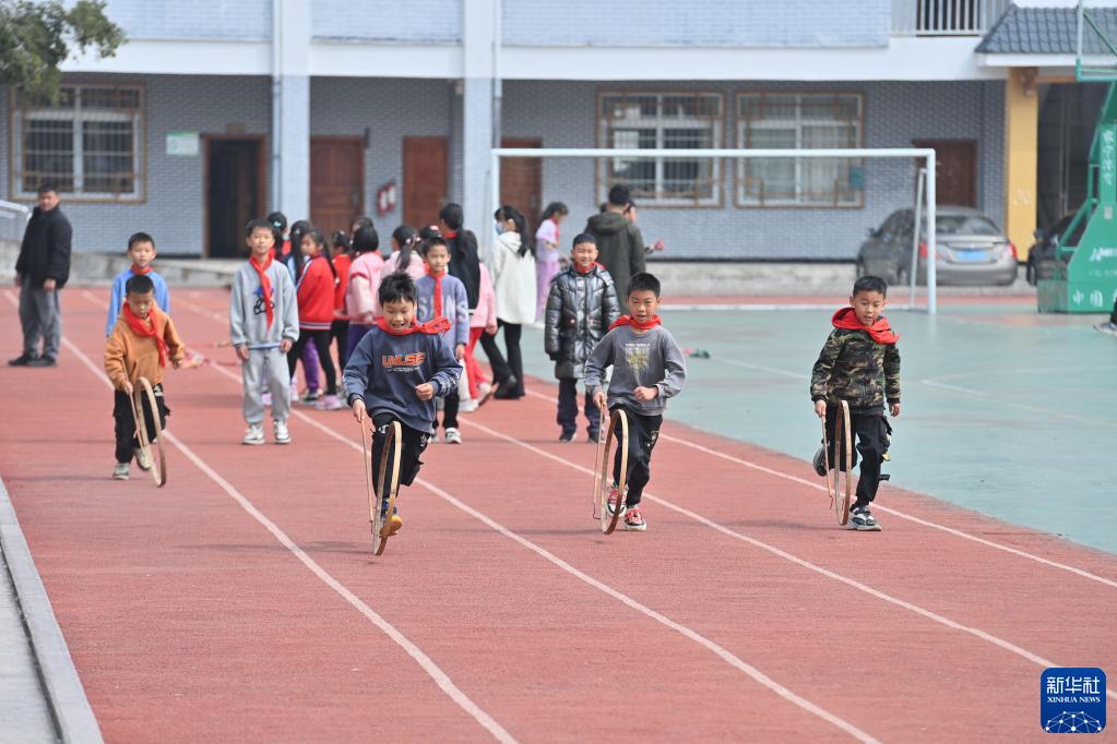 在廣西梧州市蒙山縣夏宜民族學校,學生們在體育課上滾竹環(huán)(2月22日攝)。