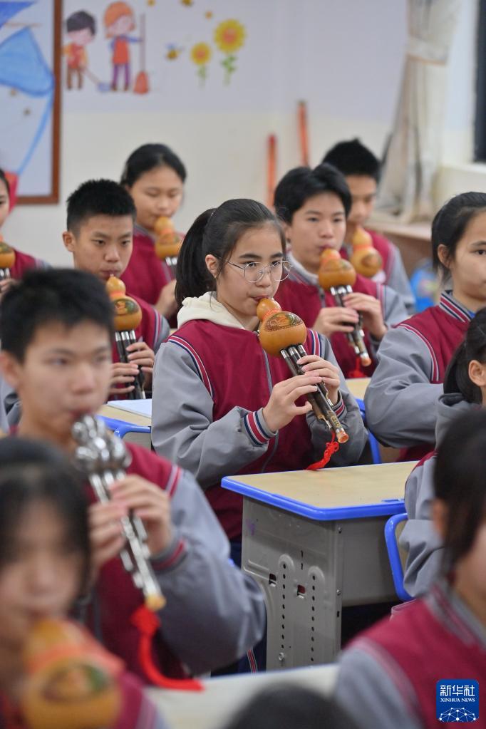 3月29日,在廣西梧州市蒼梧縣第一初級中學,學生們在吹奏葫蘆絲。