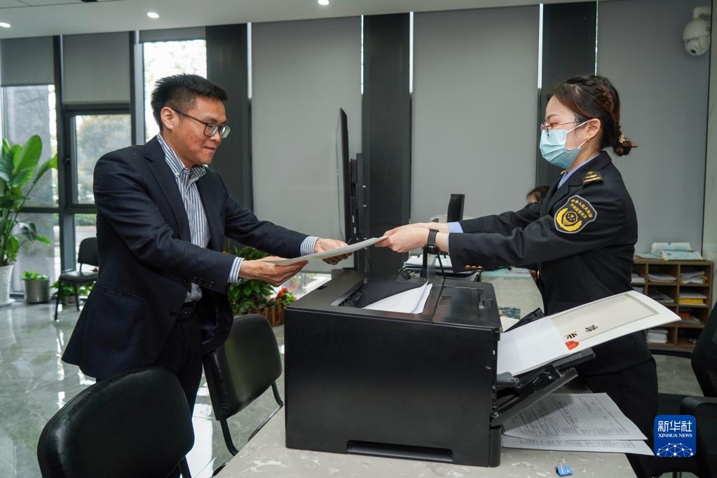 3月30日,在南京市雨花臺區市場監管局雨花分局,江蘇省第1000萬戶個體工商戶張康(左)領取個體工商戶營業執照。
