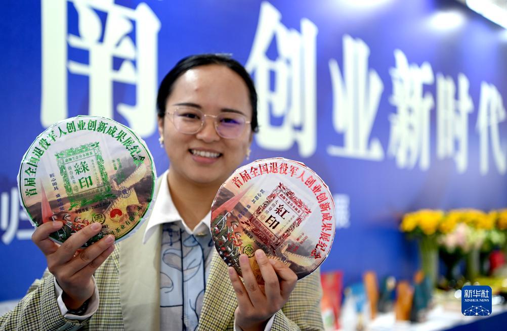 3月30日,首屆全國退役軍人創(chuàng)業(yè)創(chuàng)新成果展交會現(xiàn)場,一名參展人員展示為展會特制的紀(jì)念茶餅。