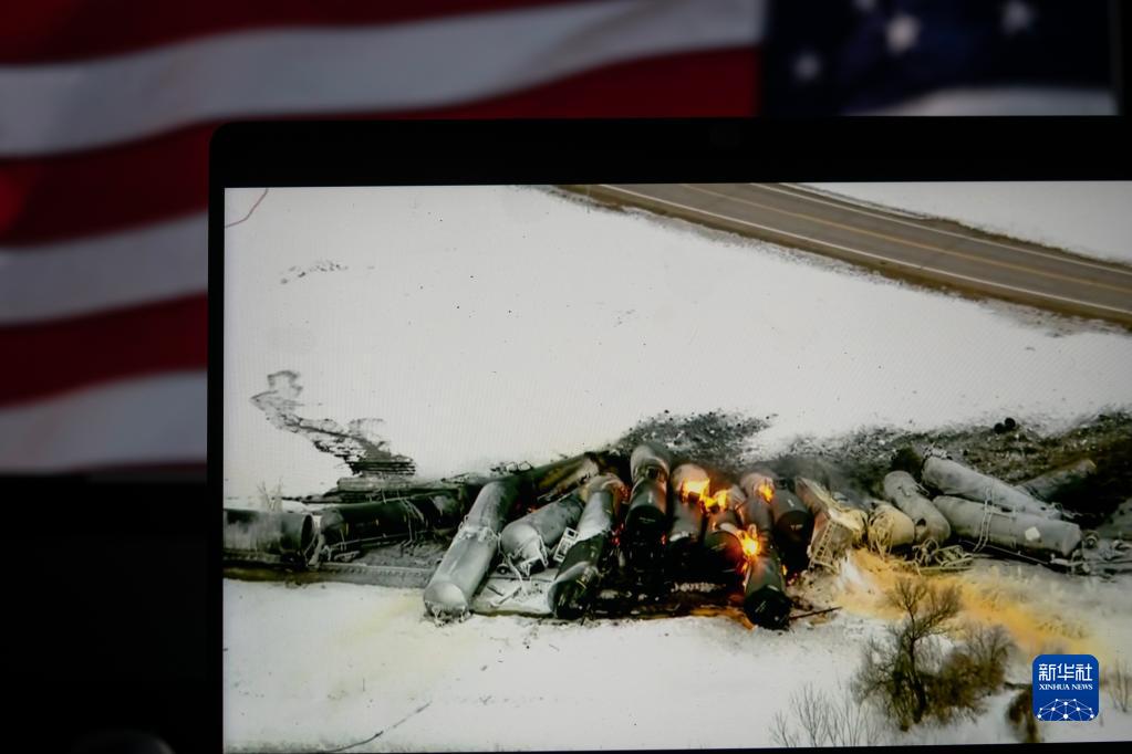3月30日在美國阿靈頓拍攝的屏幕顯示美國明尼蘇達(dá)州貨運(yùn)列車脫軌事故現(xiàn)場畫面。