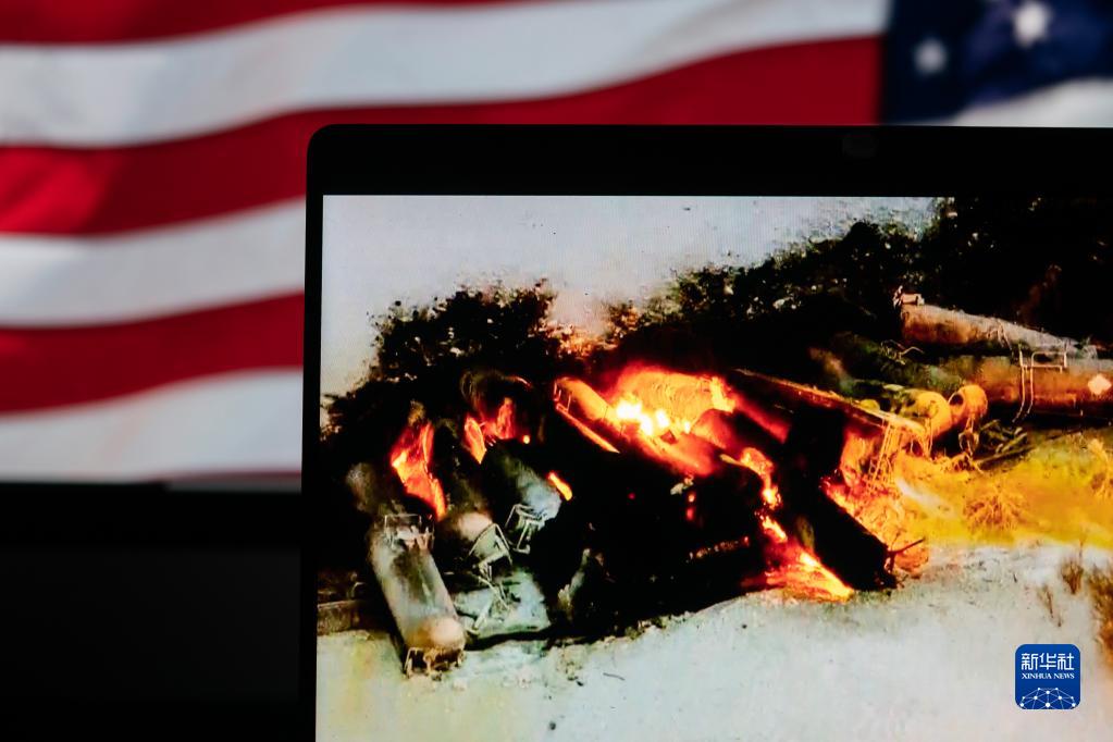 3月30日在美國阿靈頓拍攝的屏幕顯示美國明尼蘇達州貨運列車脫軌事故現場畫面。