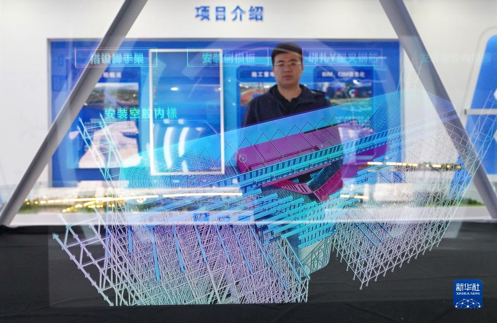 在中建八局雄東管廊項(xiàng)目科技展廳,工作人員使用全息投影技術(shù)進(jìn)行工程展示(3月20日攝)。