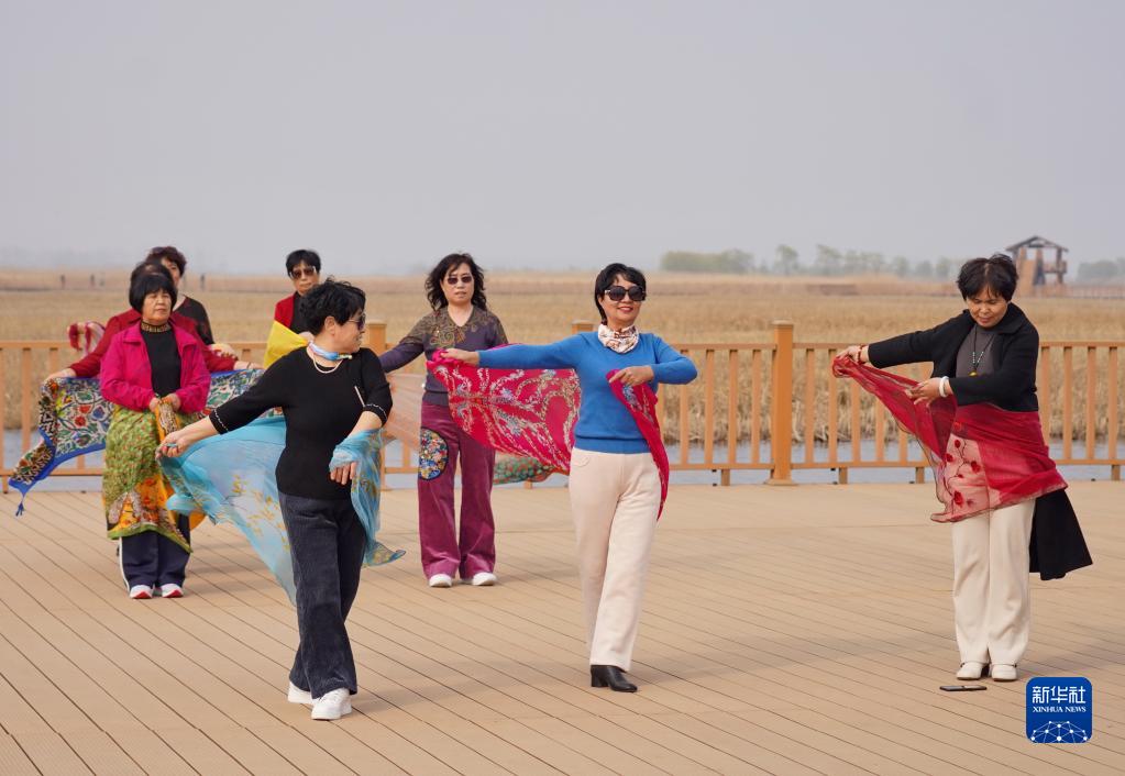 市民在雄安新區(qū)白洋淀景區(qū)排練舞蹈(3月21日攝)。