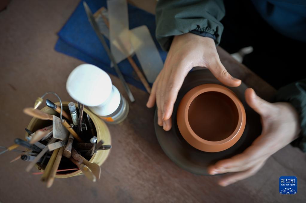 3月30日,學員在江蘇宜興西望紫砂陶瓷專業(yè)合作社學習制作紫砂壺。