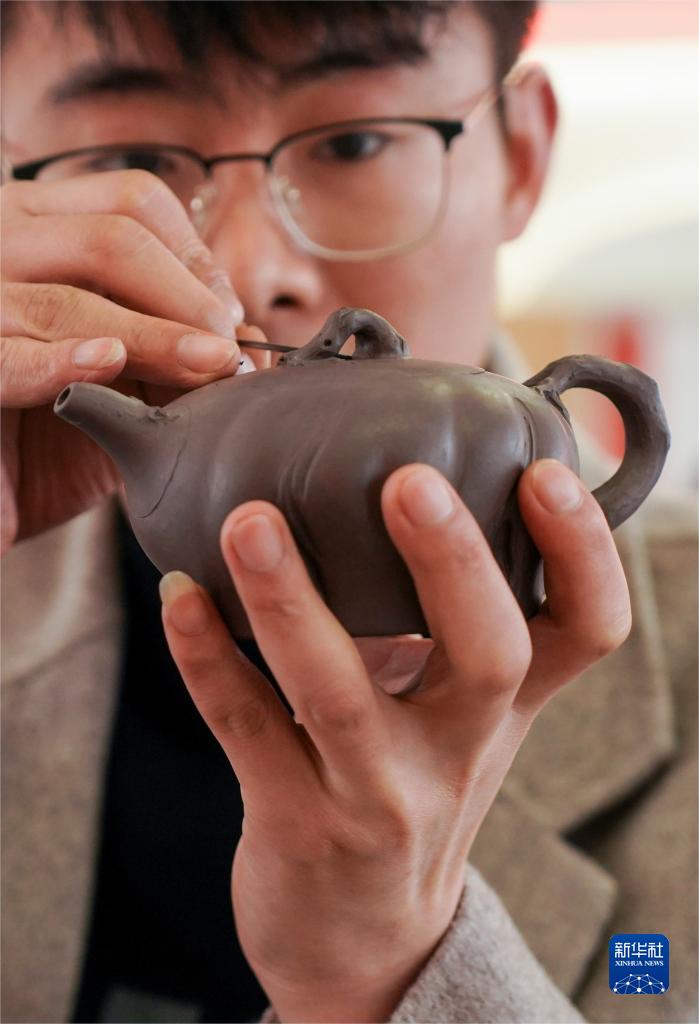 3月30日,社員在江蘇宜興西望紫砂陶瓷專業合作社練習制作紫砂壺。