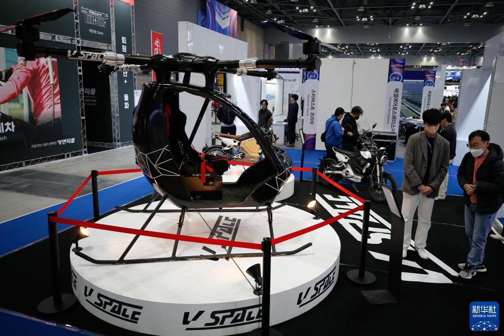 3月31日,在韓國(guó)京畿道高陽(yáng)市韓國(guó)國(guó)際展覽中心,參觀者在“2023首爾移動(dòng)出行展”上觀看城市空中交通工具。