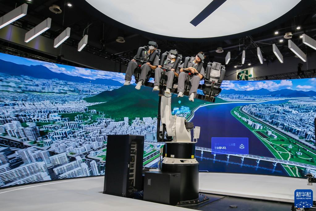 3月31日,在韓國京畿道高陽市韓國國際展覽中心,人們在“2023首爾移動出行展”上體驗虛擬城市空中交通工具。