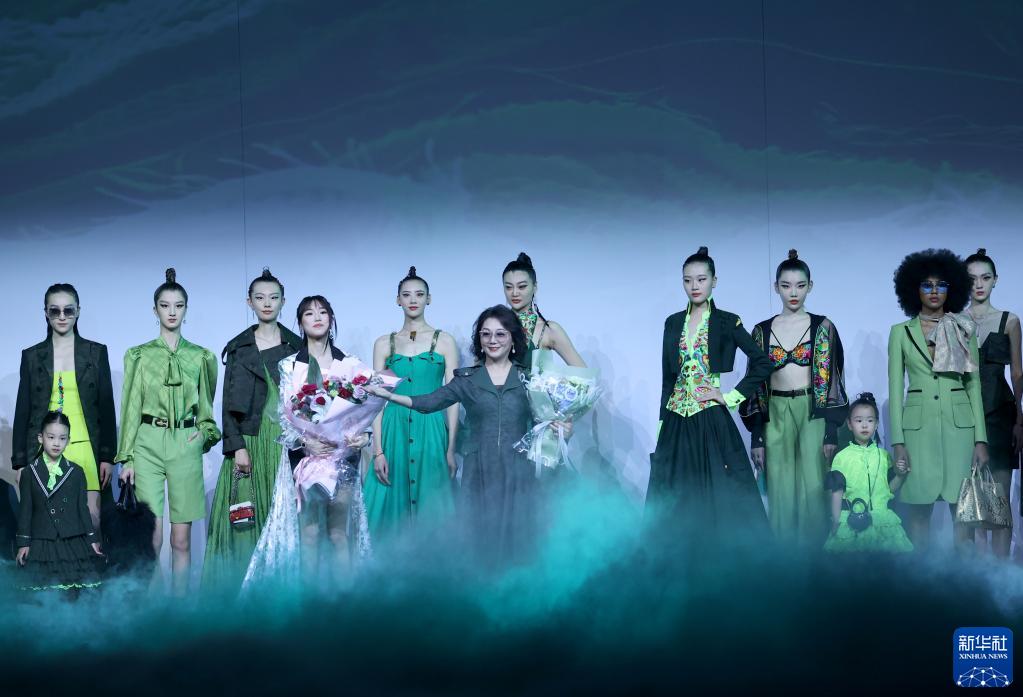 3月31日,時裝設(shè)計師劉薇(前中)和模特在發(fā)布會上謝幕。