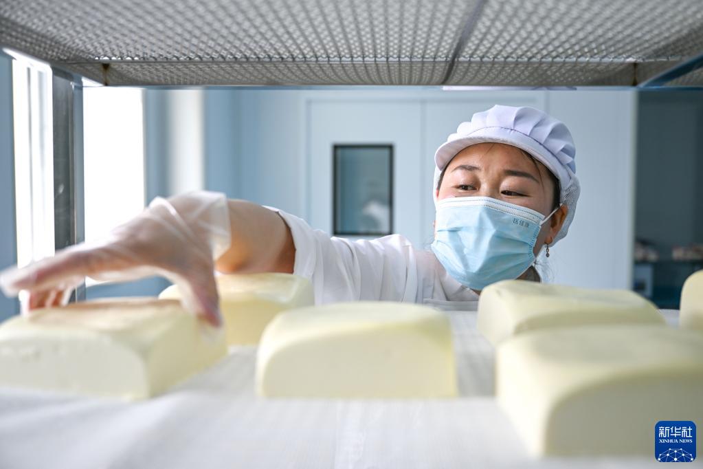 3月31日,在鑲黃旗民族傳統奶制品產業園的一家奶制品企業生產車間,工作人員查看奶豆腐冷卻情況。