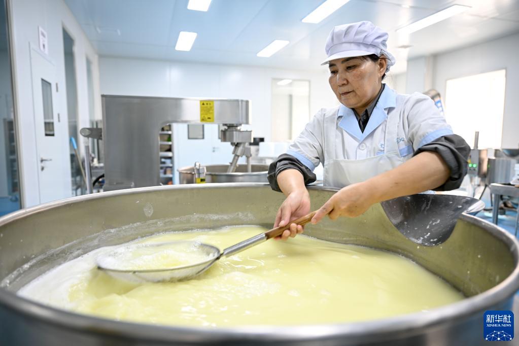 3月31日,在鑲黃旗民族傳統奶制品產業園的一家奶制品企業生產車間,工作人員在過濾奶渣。