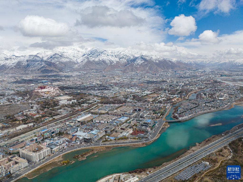 空中俯瞰拉薩雪景(3月30日攝,無人機照片)。