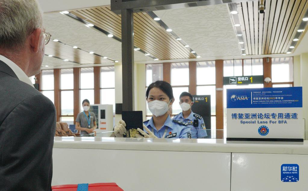 3月31日,在博鰲機場,美蘭出入境邊防檢查站執(zhí)勤民警在博鰲亞洲論壇專用通道為與會嘉賓提供通關(guān)服務(wù)。