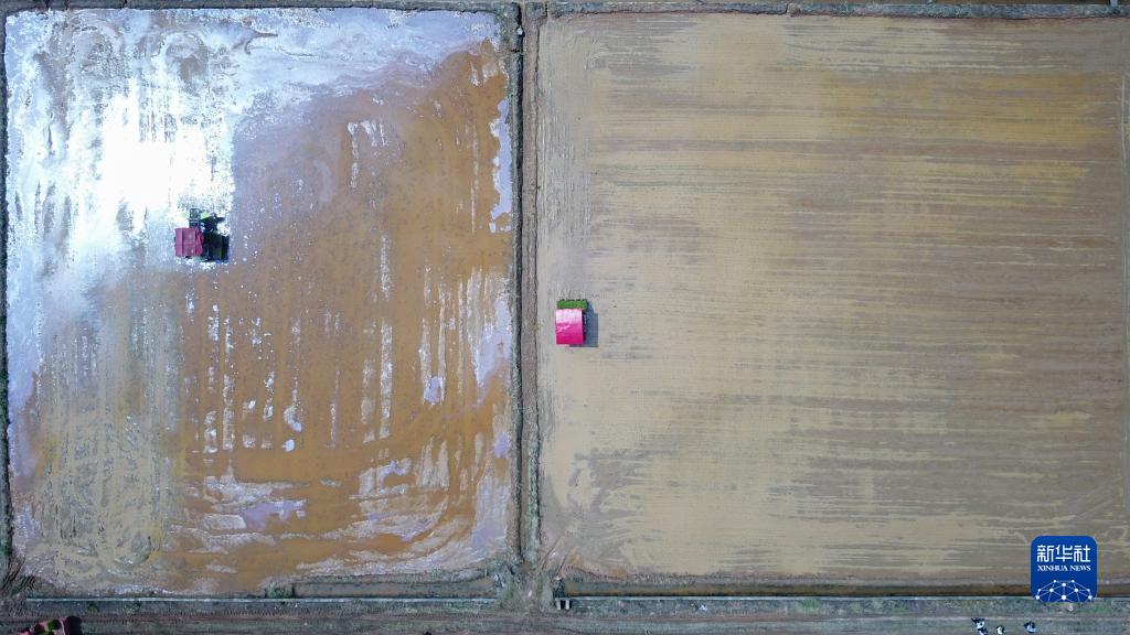 3月31日,在湖南省瀏陽市龍伏鎮的雙季稻種植示范基地,農民駕駛拋秧機、插秧機進行拋秧、插秧作業(無人機照片)。