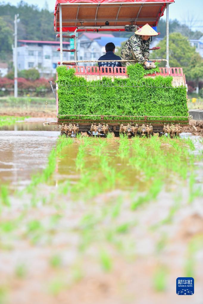 3月31日,在湖南省瀏陽市龍伏鎮(zhèn)的雙季稻種植示范基地,農(nóng)民駕駛插秧機插秧。
