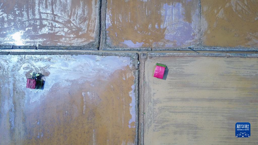 3月31日,在湖南省瀏陽市龍伏鎮的雙季稻種植示范基地,農民駕駛拋秧機、插秧機進行拋秧、插秧作業(無人機照片)。
