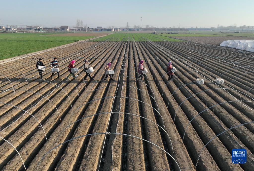 3月31日,唐山市豐潤區(qū)新軍屯鎮(zhèn)的農(nóng)民在田間搬運(yùn)準(zhǔn)備種植的種姜(無人機(jī)照片)。