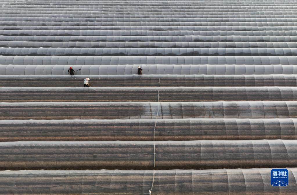 3月30日,唐山市豐潤區(qū)新軍屯鎮(zhèn)的農(nóng)民在田間給生姜棚膜覆土(無人機(jī)照片)。