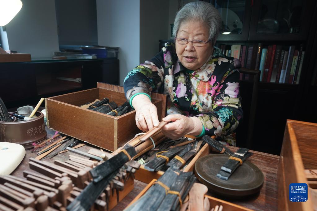 3月30日,在曹婉芬紫砂藝術(shù)館,曹婉芬在展示自制的制壺工具。