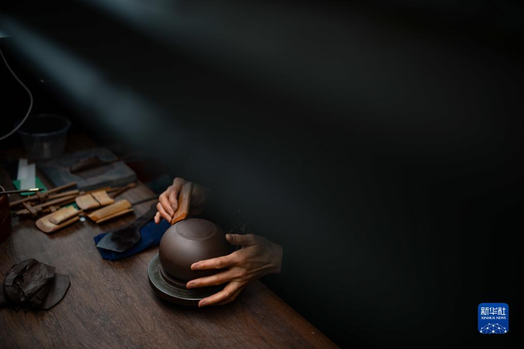 3月30日,曹婉芬的兒媳費寅媛在江蘇宜興的工作室制作紫砂壺的身筒。