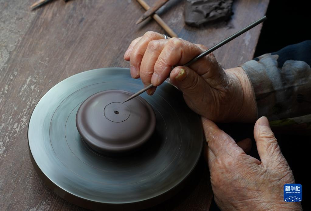 3月30日,在曹婉芬紫砂藝術館,曹婉芬在制壺。