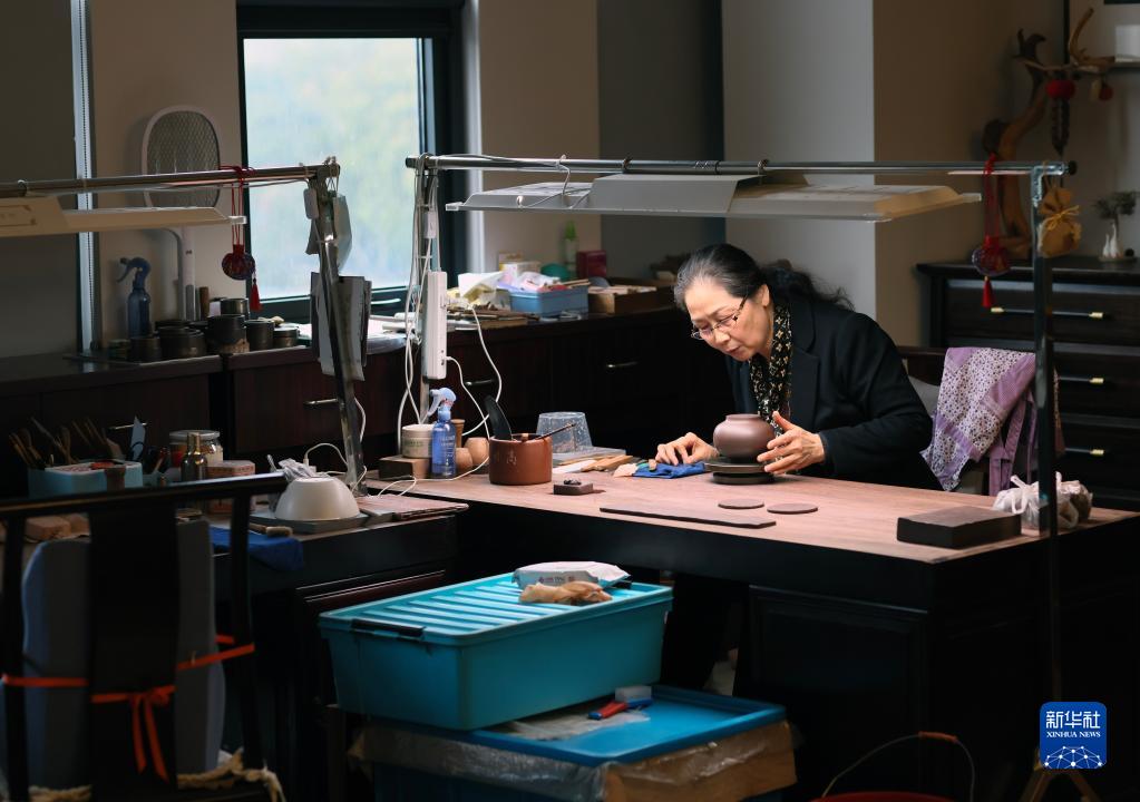 3月30日,曹婉芬的兒媳費寅媛在江蘇宜興的工作室制作紫砂壺的身筒。