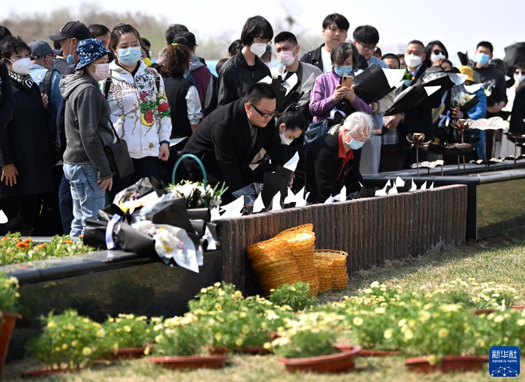 3月31日,在天津憩園,遺體捐獻者家屬在埋葬骨灰處獻花表達哀思。