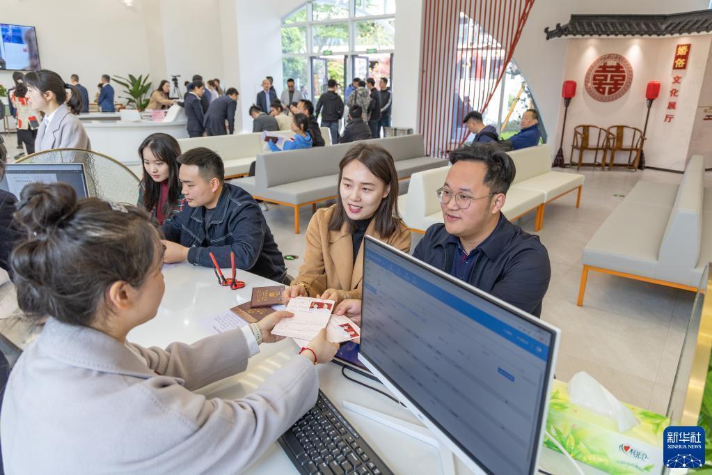 3月31日,在重慶市兩江新區(qū)婚姻登記處,一對新人從工作人員手中領(lǐng)取結(jié)婚證。