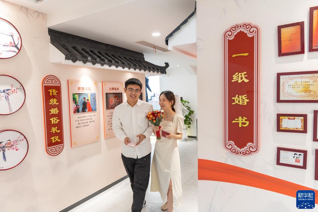 3月31日,在重慶市兩江新區(qū)婚姻登記處,新人領(lǐng)取結(jié)婚證后參觀婚俗文化展廳。