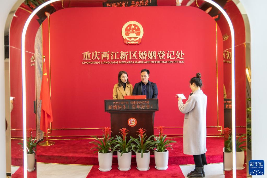 3月31日,在重慶市兩江新區婚姻登記處的頒證廳,一對新人在頒證人員的見證下宣讀結婚誓言。
