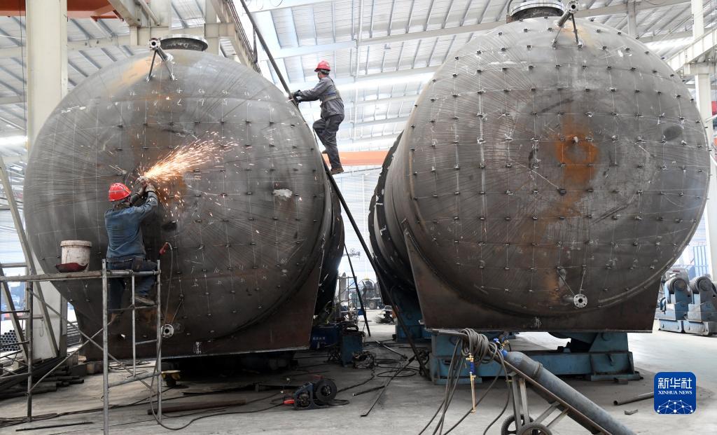 3月29日,山東省新泰市一家重工科技公司的工人在對(duì)儲(chǔ)罐進(jìn)行外表面打磨清理。