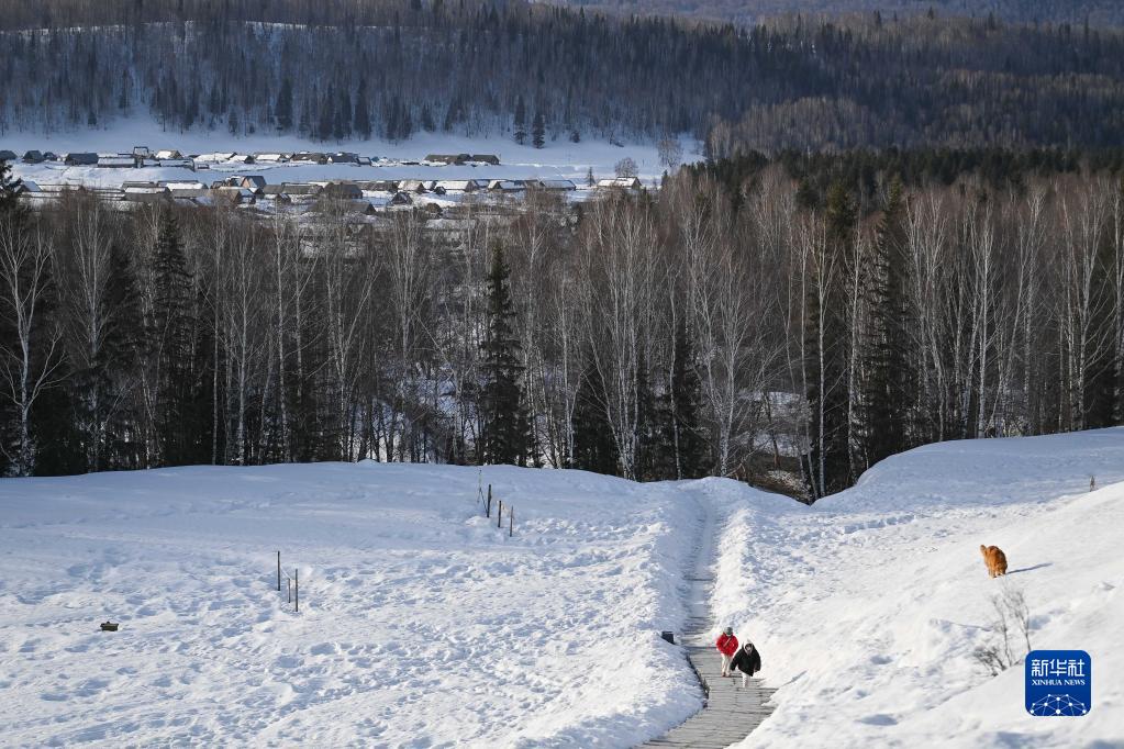 3月30日清晨,游客前往禾木村后山的觀景平臺。