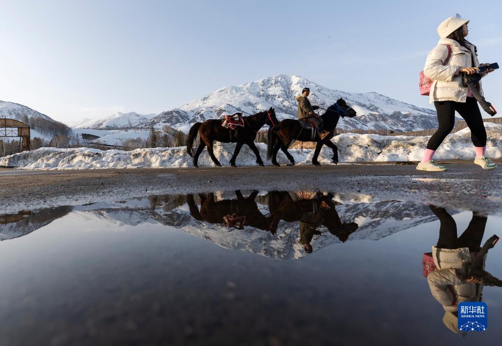 3月29日,一名村民騎馬從旅游者身旁走過。