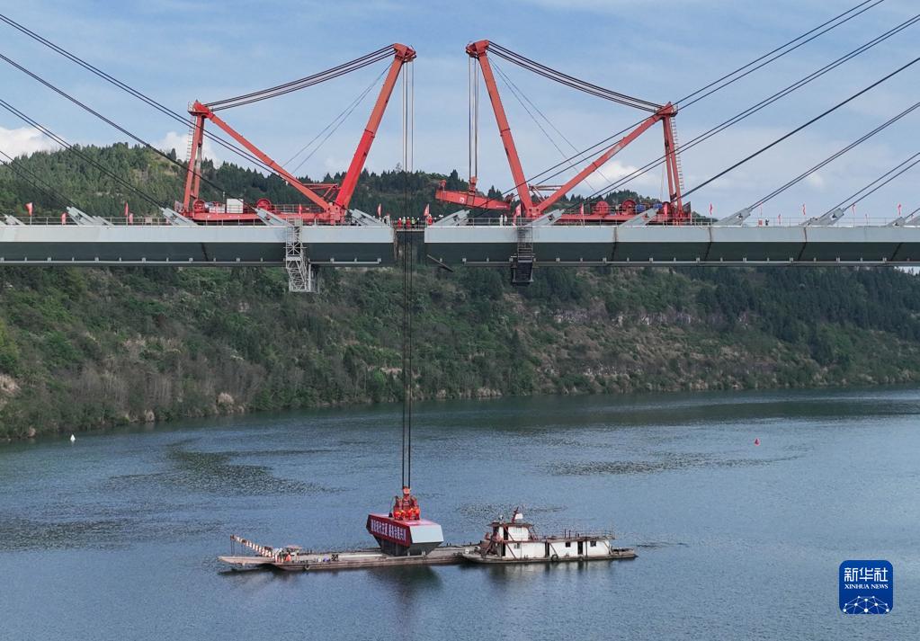 四川路橋的施工設備正在安裝漢巴南鐵路嘉陵江特大橋的最后一節(jié)段鋼箱梁(3月30日攝,無人機照片)。由蜀道集團四川路橋承建、中鐵五院設計漢巴南鐵路嘉陵江特大橋全長1770.82米,最高主塔高164.5米,是一座雙線高速鐵路高低塔混合梁斜拉橋。