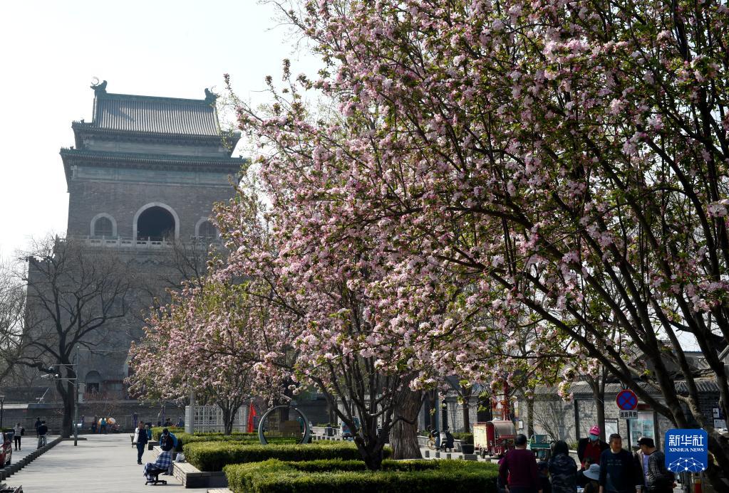 3月31日拍攝的鮮花掩映下的北京鐘樓。