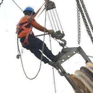 當(dāng)日,在福建漳州核電500千伏送出工程施工現(xiàn)場,施工人員在橫跨1500米的漳江跨越線路百米上空進行四回線路同時跨江作業(yè),全力推進工程進度。