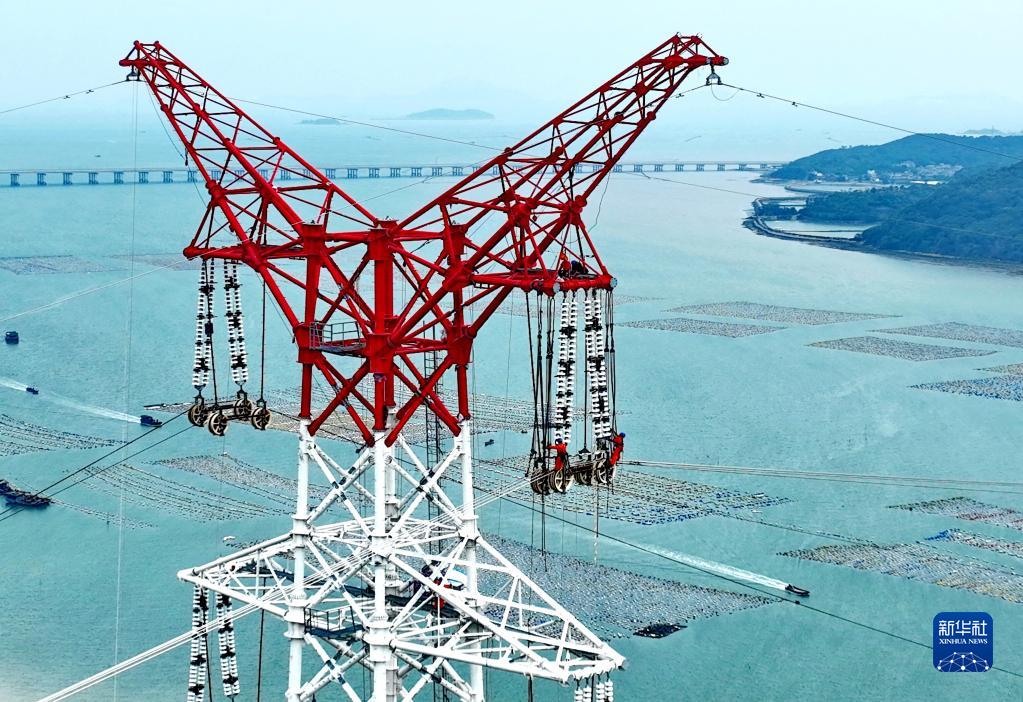 當日,在福建漳州核電500千伏送出工程施工現場,施工人員在橫跨1500米的漳江跨越線路百米上空進行四回線路同時跨江作業,全力推進工程進度。