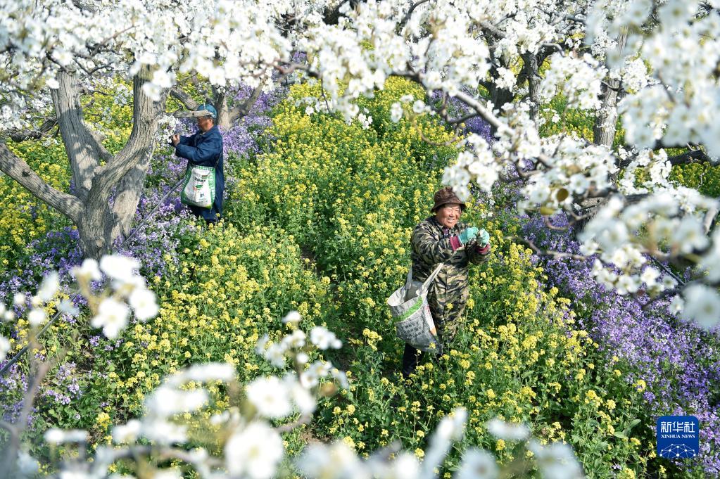 3月30日,河北省石家莊晉州市周家莊鄉第九生產隊的果農在梨園內疏花。