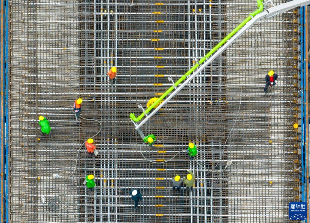 3月30日,中交二航局工人在安徽省馬鞍山巢馬城際鐵路建設(shè)現(xiàn)場進(jìn)行首跨公路梁混凝土澆筑作業(yè)(無人機(jī)照片)。