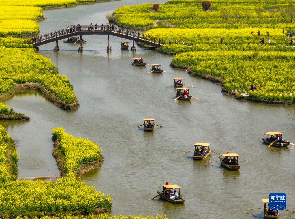 3月31日,游客在江蘇省興化市千垛景區乘船游覽(無人機照片)。